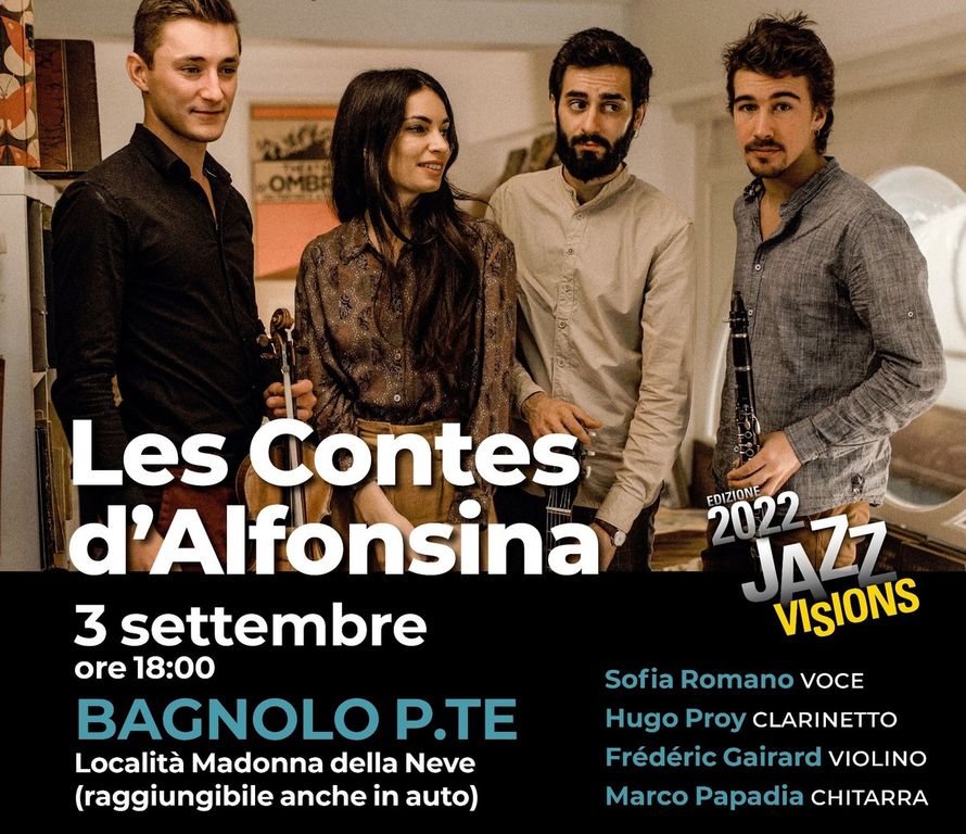 Il sagrato del Santuario di Madonna della Neve, a 970 m. di altitudine (raggiungibile in auto) è un luogo meraviglioso, con una vista mozzafiato sulla pianura sottostante, che alle ore 18 sarà illuminata dal sole radente. Ancora una volta Jazz Visions punta all’eccellenza, portando sul palco il gruppo internazionale Les Contes d’Alfonsina, con la voce di Sofia Romano, Hugo Proy al clarinetto, Frédéric Gairard al violino e la chitarra di Marco Papadia. Quattro virtuosi che uniscono la piacevolezza d’ascolto con una ricerca raffinata che si dedica alla composizione e alla fresca riproposizione di grandi classici. Les Contes d’Alfonsina è una locomotiva leggera in viaggio attraverso gypsy jazz, canzone d’autore e composizione classica, con un repertorio di ispirazione gitana manouche dal taglio moderno e orchestrale e per un’attenzione inedita alla narrazione. Il risultato è un’identità ibrida e un estetismo raffinato a cavallo tra gli universi culturali e musicali dei quattro musicisti.