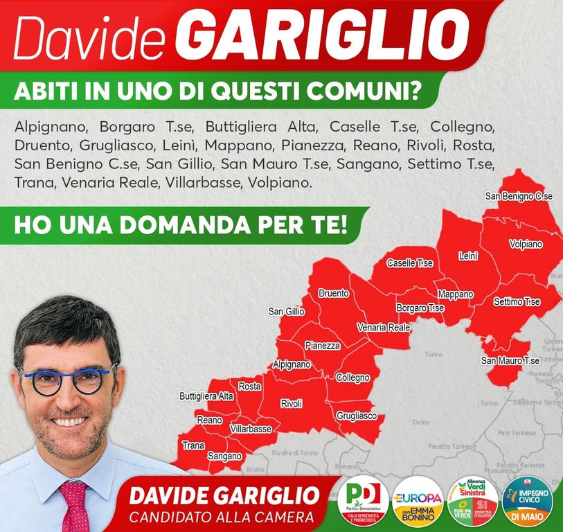 Garantire un servizio di trasporto pubblico locale adeguato è uno degli obiettivi di Davide Gariglio, Candidato alla Camera per il Partito Democratico (Piemonte 1) nel Collegio di Collegno (comuni di Alpignano, Borgaro Torinese, Buttigliera Alta, Caselle Torinese, Collegno, Druento, Grugliasco, Leinì, Mappano, Pianezza, Reano, Rivoli, Rosta, San Benigno Canavese, San Gilio, San Mauro Torinese, Sangano, Settimo Torinese, Trana, Venaria Reale, Villar Basse, Volpiano).