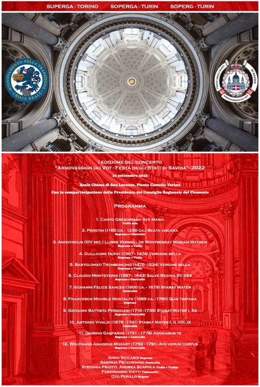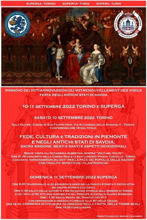 L’importante evento, organizzato dalla delegazione “Piemonte e Stati di Savoia” del movimento culturale “Croce Reale – Rinnovamento nella Tradizione” con il sostegno della Presidenza del Consiglio Regionale del Piemonte e la collaborazione della direzione della Basilica di Superga, affidata alla comunità religiosa del SERMIG (Servizio Missionario Giovani) di Torino, avrà inizio sabato 10 settembre, presso la Sala Valfrè della chiesa di San Filippo Neri (ingresso da via Accademia delle Scienze, 11), nel cuore della Torino sabauda, con il convegno sul tema “Fede, cultura e tradizioni in Piemonte e negli antichi Stati di Savoia: Sacra Sindone e devozione mariana nel Piemonte sabaudo”.