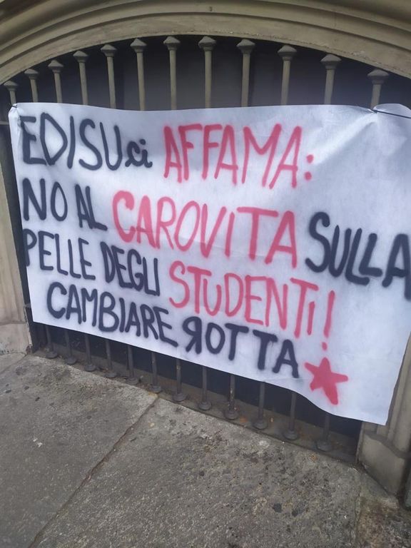Uno striscione di protesta da parte degli studenti "contro il caro-mense" e per "la sostenibilità del diritto allo studio" è stato affisso questo pomeriggio fuori dalla Sala studio Edisu di via Michelangelo Buonarroti, a Torino.