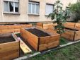 Otto cassoni di legno all’interno del giardino di Eva. Si potranno coltivare piante, frutta e verdura