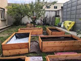 Otto cassoni di legno all’interno del giardino di Eva. Si potranno coltivare piante, frutta e verdura