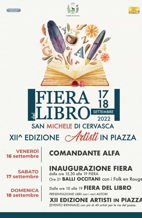 Domenica dalle 10 del mattino circa, 40 artisti del territorio presenteranno le loro opere nella piazza della frazione. A fare da introduzione alla Fiera del Libro, alle 20:45 di venerdì 16 settembre nel salone polivalente del capoluogo, la serata dedicata alla figura del Comandante Alfa, il carabiniere più decorato d'Italia, e la presentazione del suo ultimo libro: Parola d'ordine: proteggere – La mia vita in difesa degli altri. A moderare la serata, la giornalista Ada Origlia.