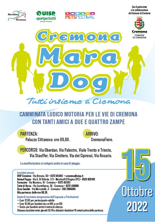 Cosa c’è di più bello che camminare con il tuo migliore amico? Boh, direte voi ma amico a due o quattro zampe? L’uno o l’altro e magari entrambi se fosse possibile sarebbe anche meglio! Ed ecco come nasce Cremona Maradog, l’occasione per fare quattro passi in città, in realtà sono circa 3 kilometri, che prenderà il via sabato 15 ottobre alle ore 09,00 da Palazzo Cittanova e snodandosi per le vie cittadine porterà i partecipanti direttamente a CremonaFiere dove è previsto l’arrivo e l’ingresso a Petsfestival.