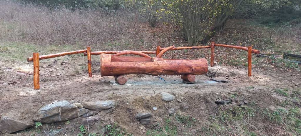 Dopo aver realizzato e posizionato il basamento in cemento e pietra, i volontari della squadra hanno posizionato la recinzione e la fontana in legno, intagliata dal volontario Dario Brunetto.