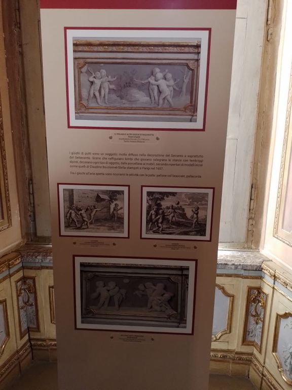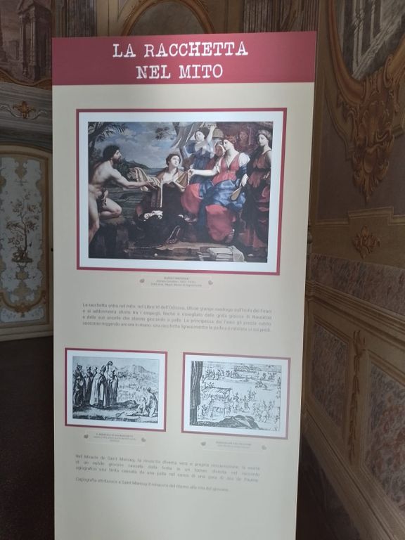 La storia del gioco, la sua funzione educativa per il corpo e lo spirito, gli spazi e l’attrezzatura vengono narrati mediante pannelli che presentano accattivanti immagini d’epoca e brevi commenti esplicativi. Tra i rari e preziosi oggetti d’epoca esposti spicca la baletta (pallina) tardo rinascimentale.
