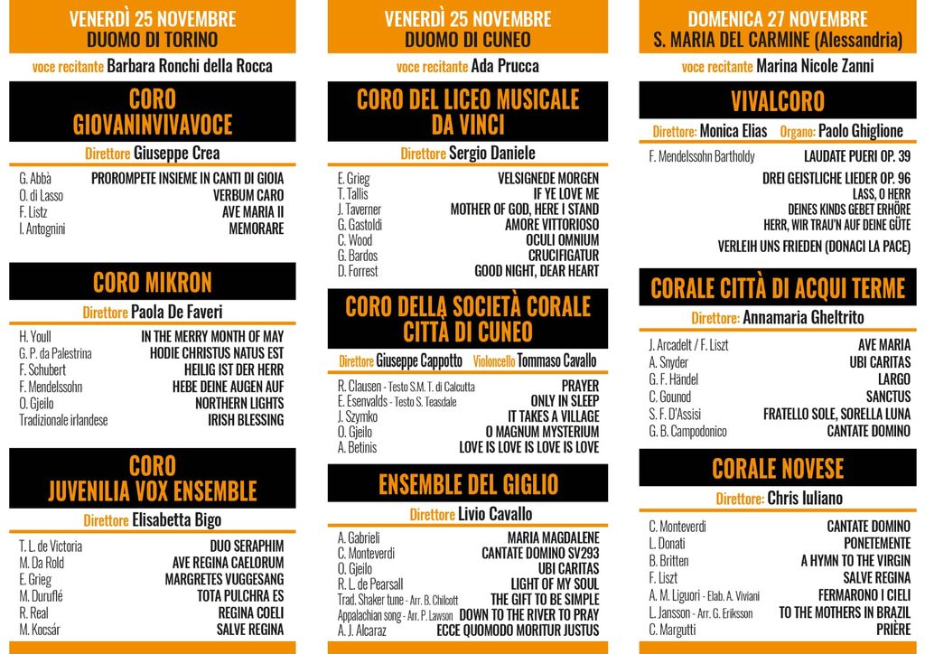 Analoga iniziativa si realizzerà anche nel Duomo di Cuneo e in Santa Maria del Carmine di Alessandria, organizzata da Associazione Cori Piemontesi in collaborazione con i Club Soroptimist delle rispettive province.