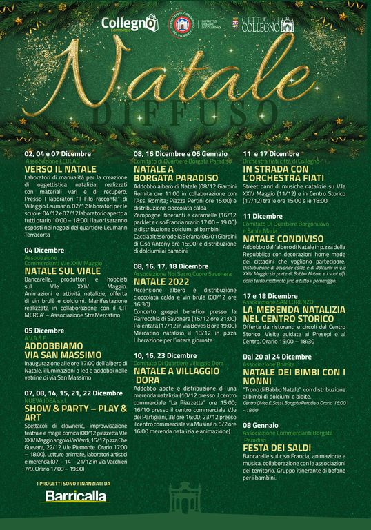 Grande successo per il bando del comune di Collegno con cui, grazie a un contributo della società Barricalla, l’Amministrazione ha messo a disposizione le risorse per gli eventi natalizi nelle vie commerciali, il “Natale Diffuso”, al quale hanno risposto ben 12 realtà del territorio tra Comitati di quartiere, Associazioni di via e imprese, porterà a partire dal 2 dicembre l’atmosfera del Natale in tutti i quartieri e nelle vie commerciali della Città.