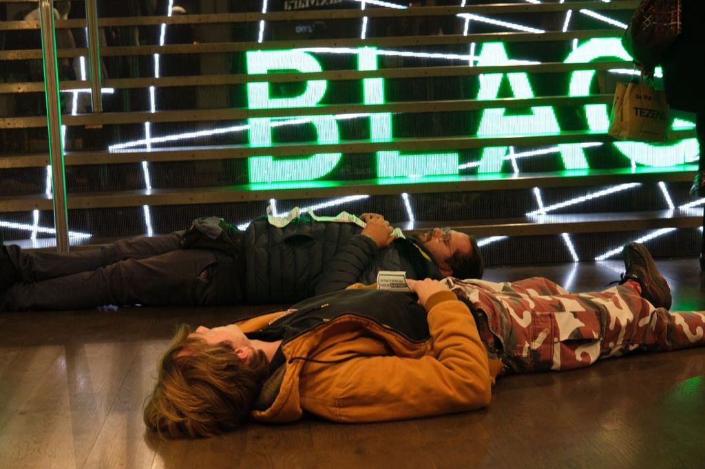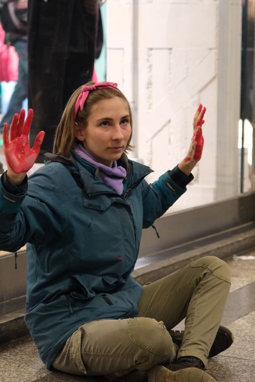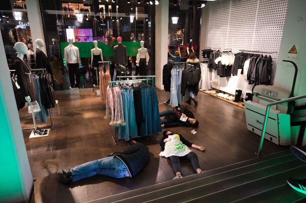 Intanto, poco distante, attivisti e attiviste di FFF hanno fatto un flash-mob dentro a Bershka in Via Roma, mostrando le mani insanguinate di "compagnie che sfruttano i lavoratori e il nostro Pianeta per produrre quantità esagerate di vestiti: basti pensare che 11 milioni di capi vengono buttati ogni anno".