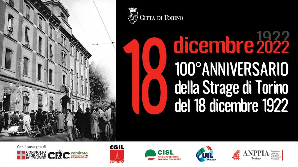 A 100 anni, la Città ricorda la "Strage di Torino", che avvenne tra il 18 e il 20 dicembre 1922. Squadre fasciste misero in atto violenze contro gli oppositori del regime, in particolare nei quartieri operai: vennero uccise undici persone, tra cui il consigliere comunale Carlo Berruti e una trentina di altre rimasero ferite.