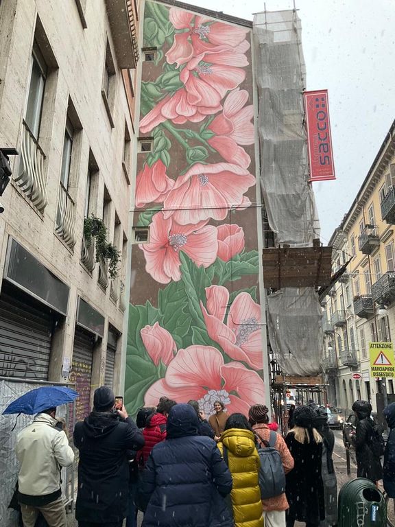 Inaugurazione sotto la neve per il murales floreale dell’artista Doa Oa. L’opera dal titolo “Althaea officinalis L.” occupa la parete di quella che è considerata una vera e propria "porta della città” in via Fratelli Calandra 10. La parete è anche un ingresso ideale che invita verso il centro, in quanto prolungamento di corso Massimo D'Azeglio.