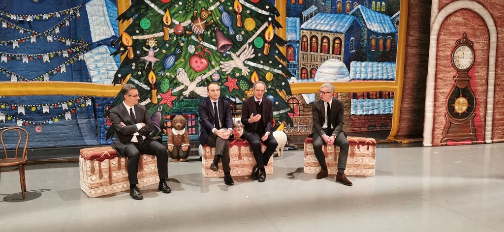 Il sindaco Lo Russo, il sovrintendente Jouvin e i vertici di reale Mutua sul palco del Teatro Regio, allestito per le repliche di "Lo Schiaccianoci"