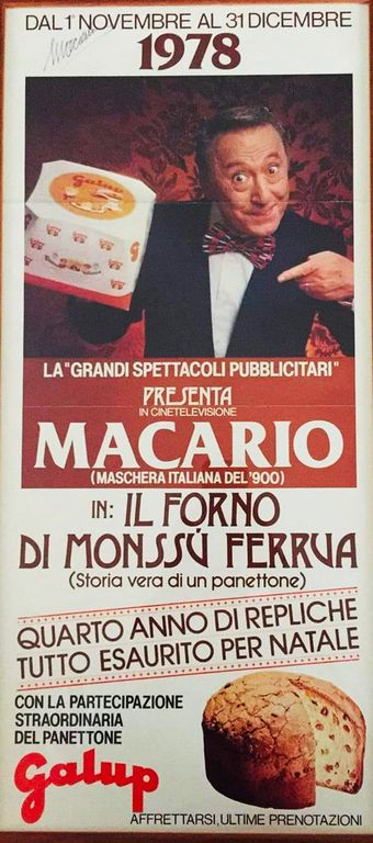 Intenso e duraturo è il legame di Erminio Macario con Galup, che è sponsor della mostra e presente in manifesti e filmati. L’immagine di Macario sotto i portici di Pinerolo, mentre gusta una fetta di soffice panettone esclamando quanto è Galup (goloso), è entrata nella storia della televisione, ma anche nei più cari ricordi degli italiani. Così come i manifesti pubblicitari, dove il grande attore comico sfoggia il suo inconfondibile ricciolo ribelle. Un rapporto privilegiato e speciale, che ha contribuito, in maniera decisiva, a far conoscere all’intero Paese la bontà e la genuinità del Panettone basso e largo piemontese: Macario e Galup hanno attraversato la storia e rappresentano tutt’ora due autentiche eccellenze del nostro Piemonte.