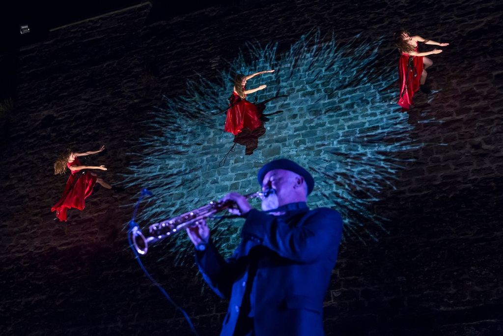 Lo spettacolo dona alla città uno skyline potente dove la poesia della danza e della musica dipingono nuove prospettive e visioni. I danzatori si muovono leggeri con una diversa gravità, sospesi ma solidamente attaccati alle architetture che fanno da cordone ombelicale alle dinamiche e al guizzo energico del volo.