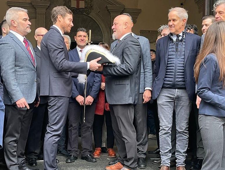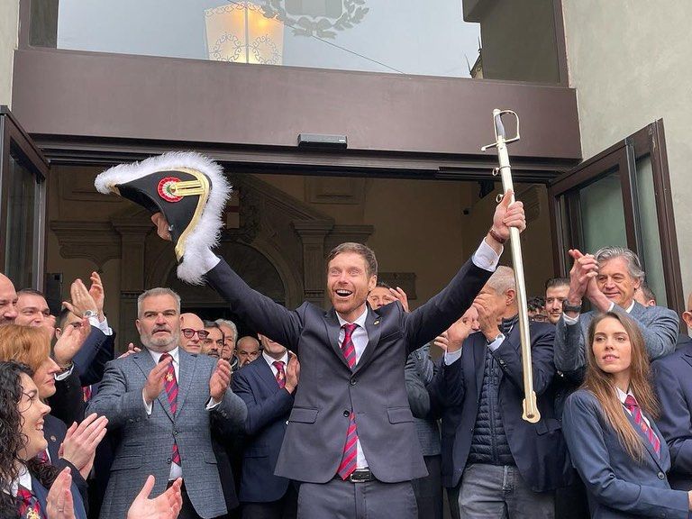 A Ivrea, a mezzogiorno, la tradizionale investitura del Generale in piazza di Città. Eporediese classe 1983, residente a Chiaverano, osteopata, è Marcello Feraudo il personaggio maschile principale dell'edizione 2023 dello storico carnevale eporediese.
