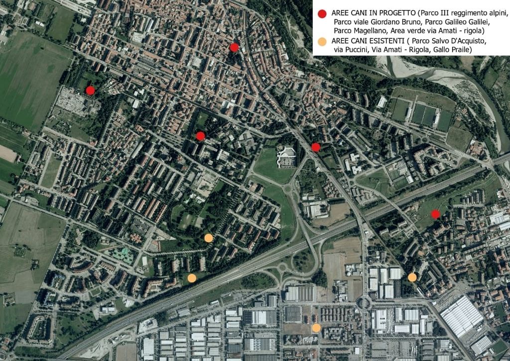 Le cinque aree saranno di circa 750 mq l’una, delimitate da recinzione metallica dell’altezza di 2,20 m fuori terra. Ogni spazio avrà il suo cancello d’ingresso pedonale, utile anche a far accedere eventuali mezzi di manutenzione del verde. Valutato che le aree cani possono promuovere momenti di aggregazione sociale, in prossimità dell’ingresso sarà realizzata una piccola area attrezzata per la fruizione ombreggiata. In prossimità dell’area sarà posata una fontanella. Infine, in corrispondenza degli ingressi sarà predisposto apposito cestino, dotato di distributore di sacchetti, per conferire le deiezioni, verrà posizionata anche apposita segnaletica indicante le principali regole di accesso e fruizione dell’area.