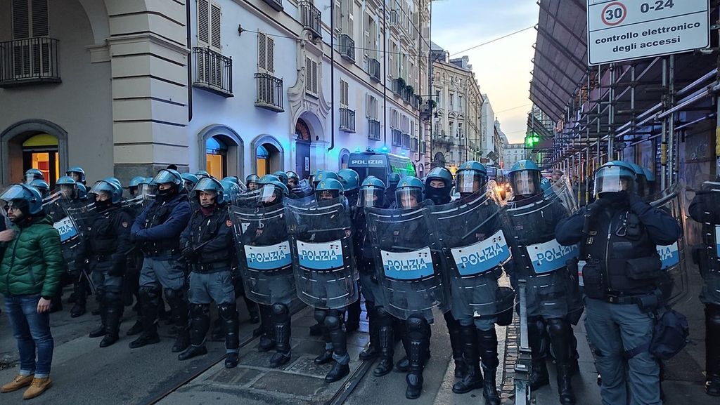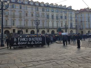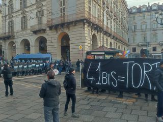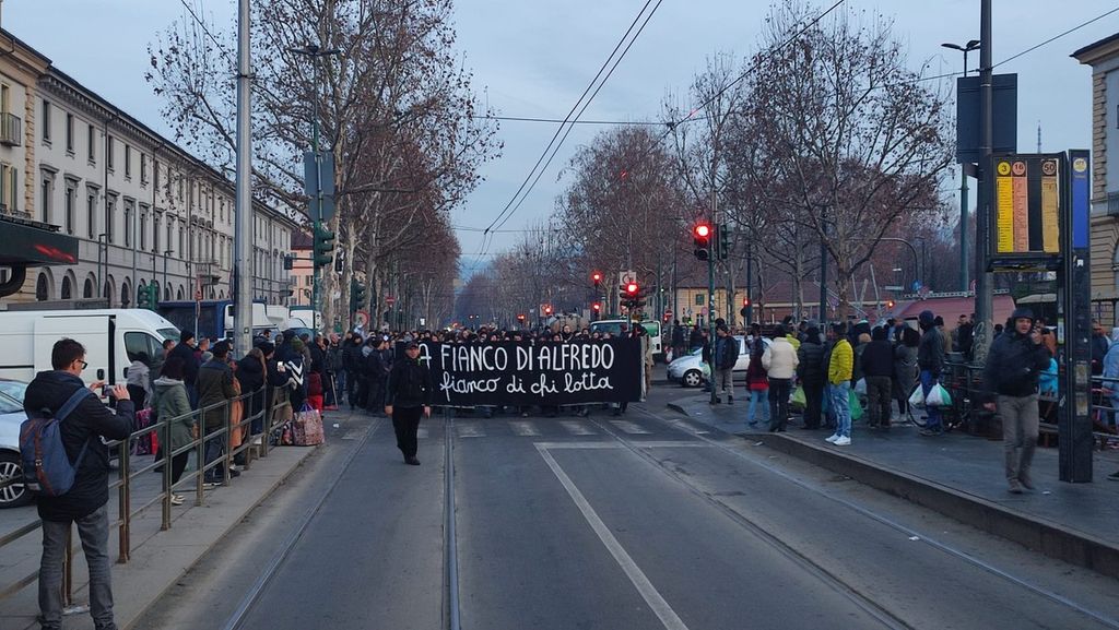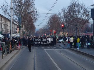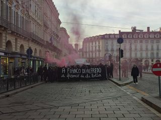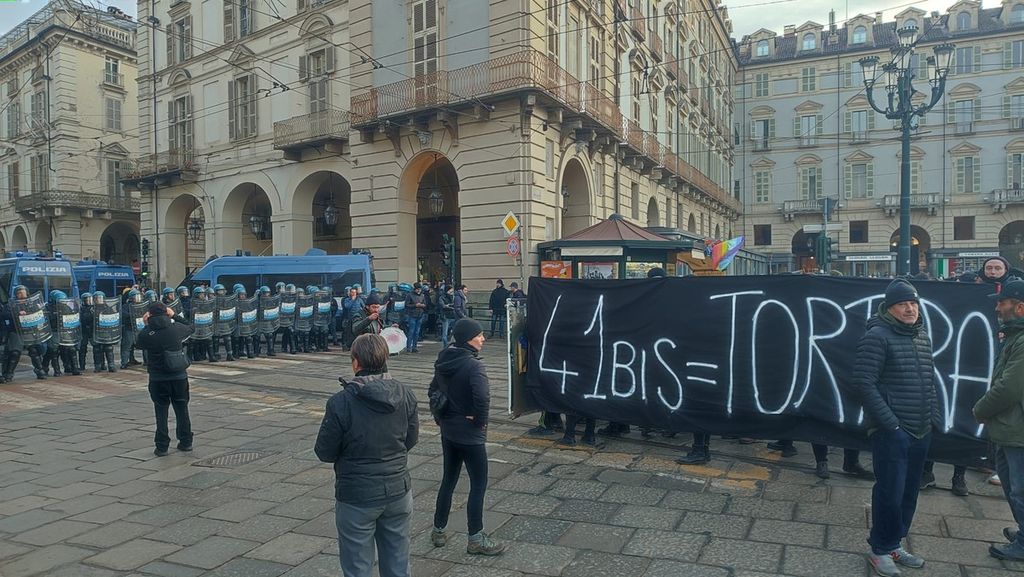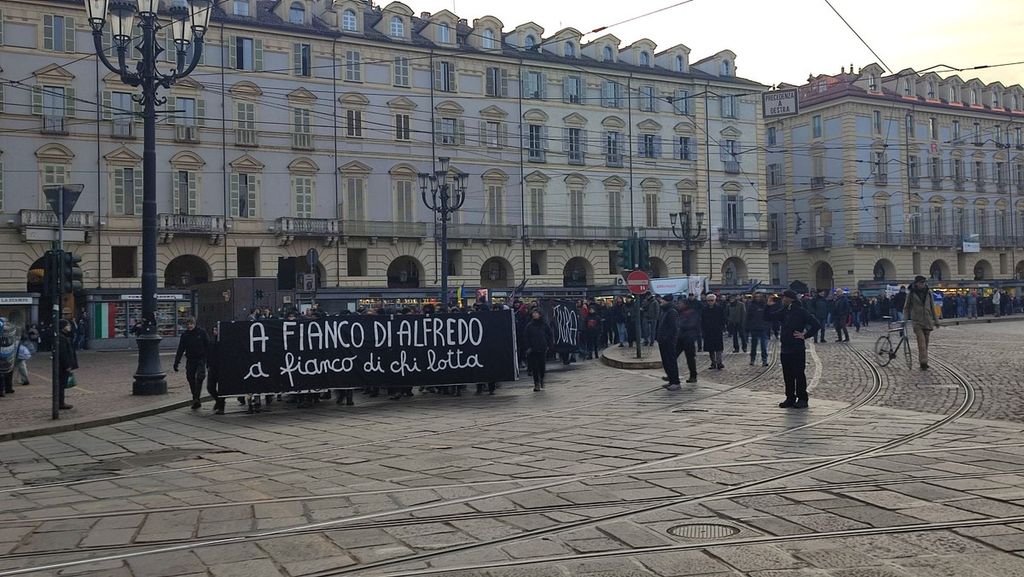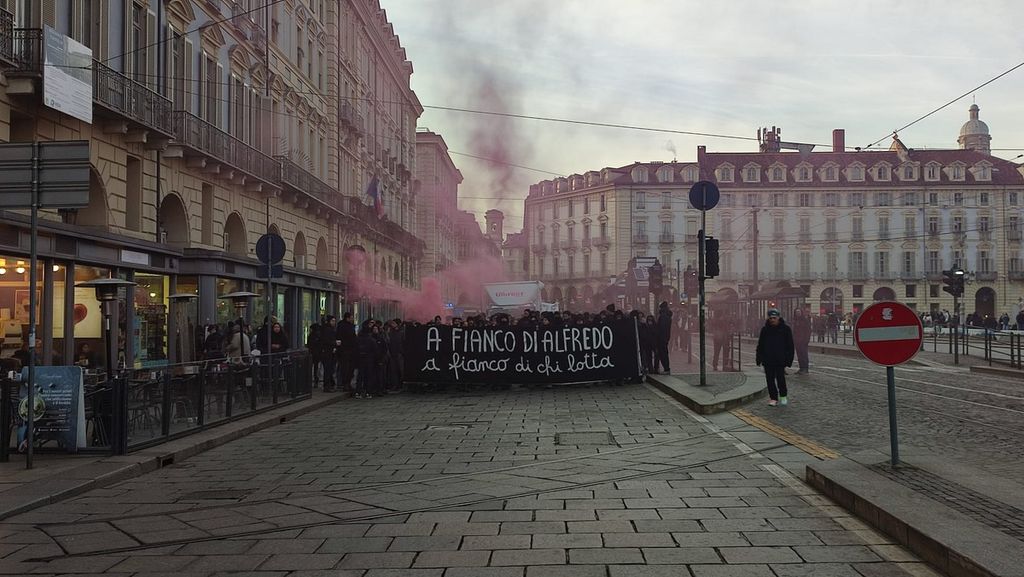 Qualche momento di tensione quando il folto gruppo di manifestanti si è riunito in piazza Castello per sostenere il militante del FAI, detenuto al 41bis e da ottobre in sciopero della fame