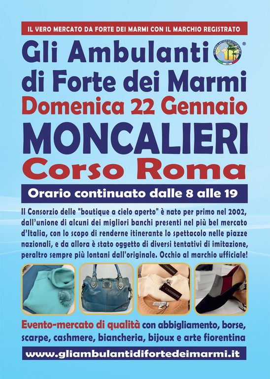 Gli Ambulanti di Forte dei Marmi: le bancarelle del mercato di qualità più famoso d’Italia tornano finalmente nell’area metropolitana di Torino, a grandissima richiesta, con tutto il meglio del Made in Italy artigianale e le ultime tendenze della moda. Si potranno ammirare le ormai mitiche “boutique a cielo aperto” dell’originale Consorzio domenica 22 gennaio a Moncalieri, nella consueta centrale location di Corso Roma. Un appuntamento da non perdere assolutamente per i tanti appassionati del genere, come sempre all’insegna dello shopping più glamour e conveniente, con orario continuato, anche in caso di maltempo, dalle 8 alle 19.