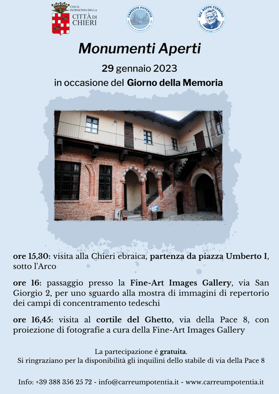 La mostra è anche frutto della collaborazione con l’Associazione Carreum Potentia. Insieme a loro, domenica verrà organizzata una passeggiata per la Chieri ebraica, col patrocinio del Città di Chieri.