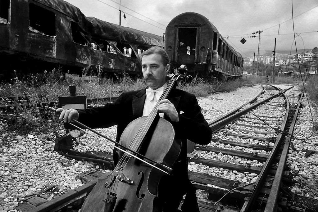 L’immagine più significativa mostra il musicista Vedran Smailović, in smoking con il suo violoncello, che suona in mezzo alla città devastata.