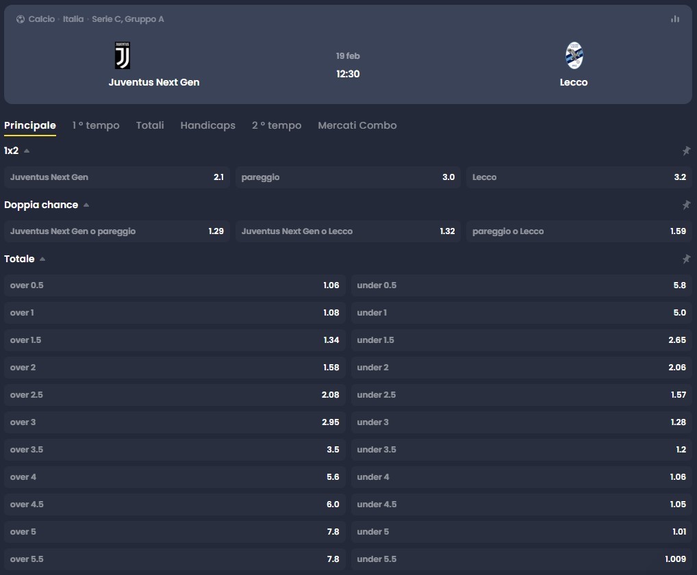 La quota offerta in questo momento per la vittoria della Juventus è un’allettante 2.10; il pareggio viene dato a 3.0 e la vittoria della Calcio Lecco a 3.20. Considerando le doppie chance, abbiamo Juventus o pareggio a 1.29; Juventus o Lecco a 1.32; pareggio o Lecco a 1.59. Guardando invece agli Under/Over, l’Over 2.5 è quotato a 2.08, l’Over 3 a 2.95, mentre l’Under 2.5 a 1.57 e l’Under 2 a 2.06.
