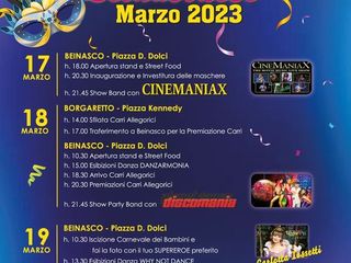 Sabato 18 marzo a Borgaretto ci sarà il cuore della festa: la sfilata dei carri allegorici, che passeranno tra le vie della città con musica, coriandoli ed entusiasmo per grandi e piccoli. Poi domenica 19 la festa continua in piazza Dolci con il carnevale dei Bambini. Tra i protagonisti annunciati, la Principessa Odessa della Melevisione, Carlotta Iossetti, infine ecco la Festa dei Colori a cura della Pro Loco di Beinasco.