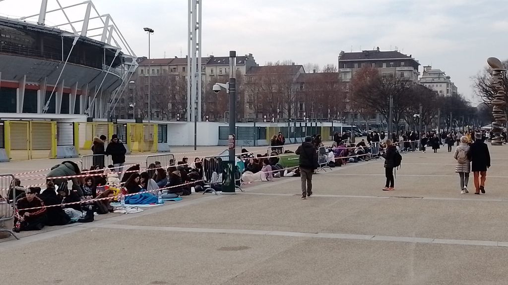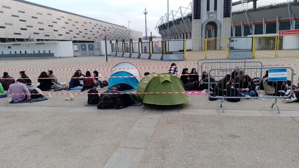 Grandissima attesa per i Maneskin, che stasera incendieranno il palco del Palaolimpico Alpitour. A piazza D'Armi da ieri sera ci sono già centinaia di ragazzi e ragazze che aspettano l'apertura dei cancelli: c'è chi ha dormito in tenda, chi si è portato i sacchi a pelo per ripararsi dal freddo, chi è arrivato stamattina all'alba. Ma c'è anche chi ha preso d'assalto l'hotel del centro dove la band è arrivata questa mattina.