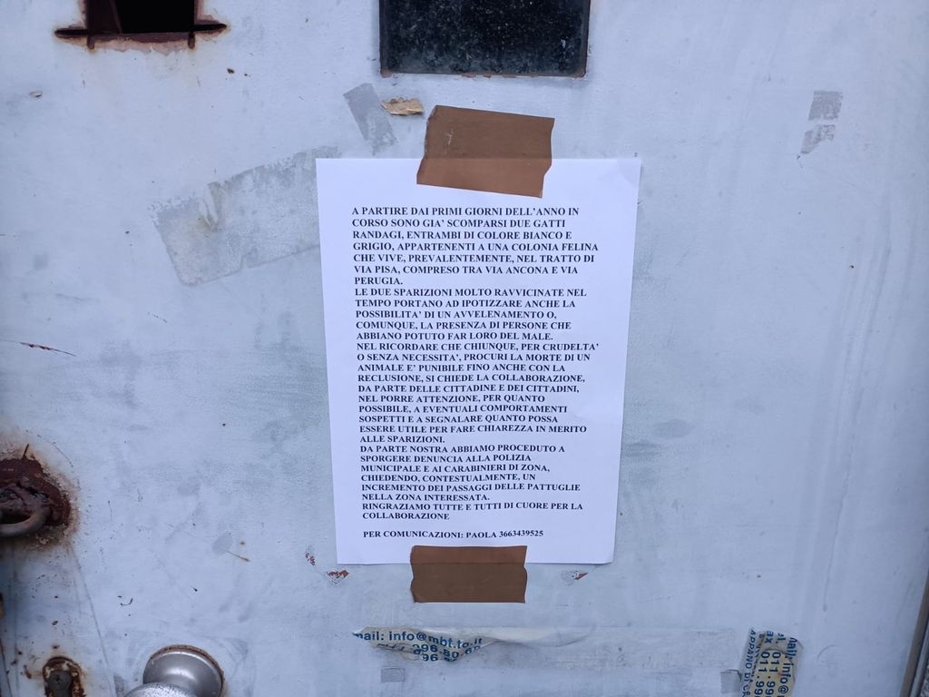 Gli animali – ribattezzati Gandhi, Clyde e Regalino- di colore bianco e grigio - fanno parte di una colonia felina non registrata tra via Pisa, via Perugia e via Ancona: “Siamo angosciati”