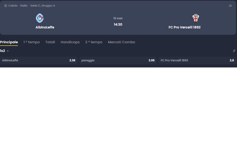 Diamo adesso un’occhiata all’altra compagine piemontese, impegnata domenica alle 14:30 fuori casa contro l’Albinoleffe. Anche in questo caso il match non è di facile lettura: lo dimostrano le quote molto equilibrate che danno l’Albinoleffe vincente a 2.36, mentre il successo della Pro Vercelli è quotato 2.80 e il pareggio 2.95.