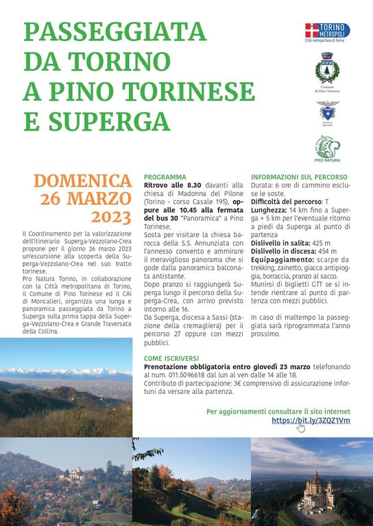Pro Natura Torino, in collaborazione con la Città metropolitana di Torino, il Comune di Pino Torinese e la sezione CAI di Moncalieri, organizza una lunga e panoramica passeggiata da Torino a Superga, sulla prima tappa della Superga-Vezzolano-Crea e della Grande Traversata della Collina. Il ritrovo dei partecipanti è previsto per le 8,30 davanti alla chiesa della Madonna del Pilone di corso corso Casale 195 a Torino, oppure alle 10,45 alla fermata del bus 30 “Panoramica” a Pino Torinese. Durante la passeggiata è prevista una sosta per visitare la chiesa barocca della Santissima Annunziata con l’annesso convento e per ammirare il panorama che si gode dalla balconata antistante. Dopo pranzo si raggiungerà Superga, con l’arrivo previsto intorno alle 16. Da Superga l’itinerario scende alla stazione della ferrovia a cremagliera di Sassi lungo il percorso 27, ma in alternativa per tornare a Torino ci si può servire dei mezzi pubblici.