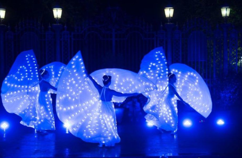 Nel contempo, il Giardino prende vita con Gli Alberi degli Elfi attorno ai quali danzano le Farfalle luminose giganti, attrici e attori dell’Accademia creativa di Perugia.