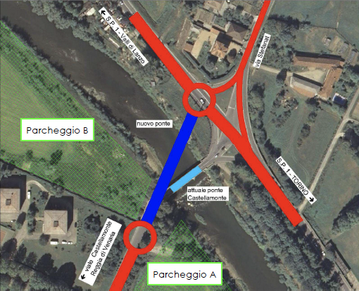 Il ponte nuovo sarà compreso tra due rotatorie: una in sponda sinistra da realizzarsi sulla Sp 1 delle Valli di Lanzo (denominata rotatoria Stefanat) e una in sponda destra (denominata rotatoria Castellamonte).