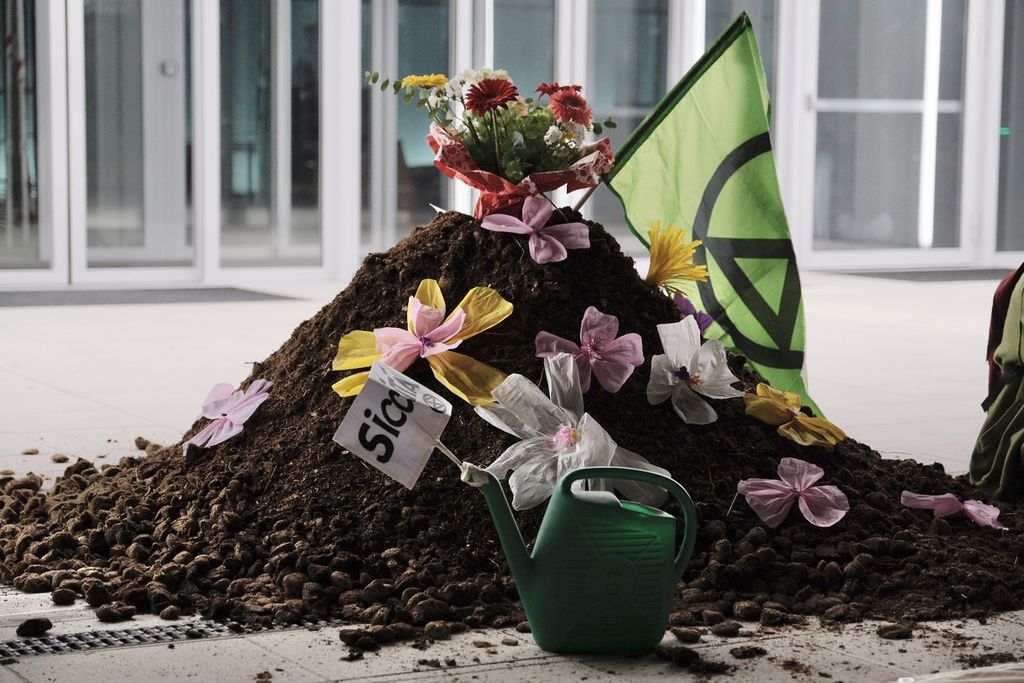 Una vera e propria montagna di letame è stata scaricata questa mattina al grattacielo della Regione Piemonte dagli attivisti Extinction Rebellion, insieme a tanti fiori lasciati sopra. Due persone si sono arrampicate sulla tettoia dell’ingresso e i trovano ancora lì. Al posto dell’insegna portata via dal vento qualche settimana fa, hanno appeso l’enorme scritta “Dalla regione non nasce niente, dal letame nascono i fiori”, riprendendo una canzone di Fabrizio De André.