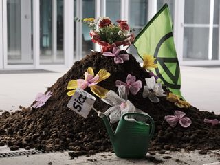 Una vera e propria montagna di letame è stata scaricata questa mattina al grattacielo della Regione Piemonte dagli attivisti Extinction Rebellion, insieme a tanti fiori lasciati sopra. Due persone si sono arrampicate sulla tettoia dell’ingresso e i trovano ancora lì. Al posto dell’insegna portata via dal vento qualche settimana fa, hanno appeso l’enorme scritta “Dalla regione non nasce niente, dal letame nascono i fiori”, riprendendo una canzone di Fabrizio De André.