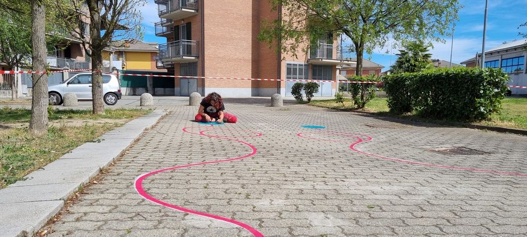 Ci sono i simboli di Vigone, come la rotonda, il campanile e il cavallo, nei sei giochi che i bambini di quarta e quinta elementare hanno ideato. Gli operatori di Circowow li stanno ‘mettendo a terra’, disegnandoli con la vernice, nei Giardini Carena di via Vallero per l’inaugurazione del 21 aprile.