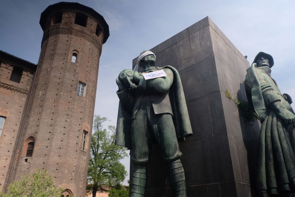 Bendate le statue in piazza Castello e via Andrea Doria. La politica si schiera: al blitz partecipano le consigliere comunali Diena e Ravinale di Sinistra Ecologista