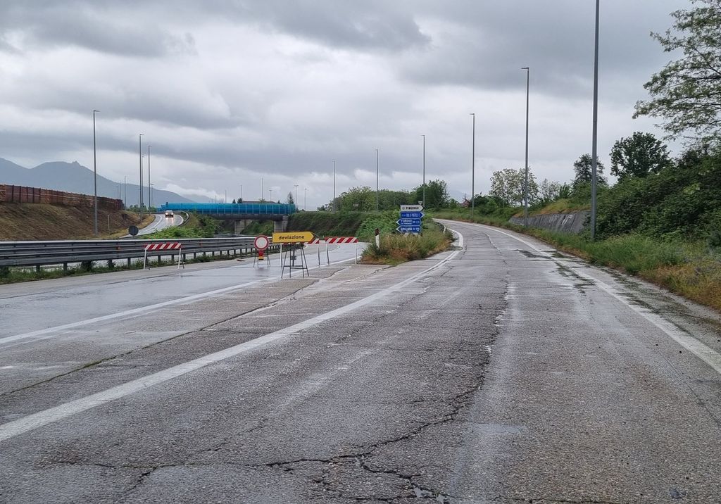 La strada è chiusa e il traffico viene deviato sulle vie laterali che portano alla rotatoria.