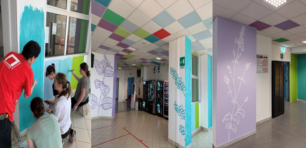 All’Ospedale di Rivoli è stato recentemente avviato il percorso condiviso dal Dipartimento Educazione Castello di Rivoli con Fondazione Magnetto e ASL TO3, finalizzato a prendersi cura dei luoghi della cura, in particolare i luoghi di accoglienza per il pubblico all’interno dell’Ospedale: un’azione di pittura collettiva ha fatto fiorire sui muri dell’atrio del primo piano un meraviglioso Giardino perenne, per rivoluzionare con la freschezza dei colori e del dinamismo cromatico gli ambienti sanitari, normalmente percepiti come freddi e austeri da chi li abita. In particolare, il progetto evoca un grande erbario di piante officinali dal potere curativo, come verbena, alloro, timo, menta, tarassaco e lavanda. Il wall painting all’Ospedale di Rivoli, a cura del Dipartimento Educazione Castello di Rivoli, che ha un forte legame con gli Istituti rivolesi e della Valsusa, è stato realizzato con un’azione partecipata insieme alle scuole del territorio, in particolare con gli studenti del Liceo Scientifico Darwin di Rivoli coinvolti nel progetto PCTO -ex alternanza scuola-lavoro e con la collaborazione organizzativa del personale dell’Ospedale di Rivoli.