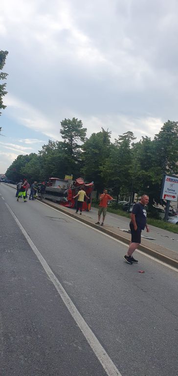 Il traffico è congestionato. L'incidente all'incrocio con via Nicola Fabrizi. Il mezzo dei vigili del fuoco si è ribaltato in mezzo alla carreggiata