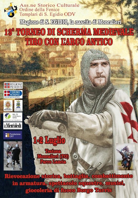 L’Associazione di Volontariato Storico Culturale “Ordine della Fenice Templari di St. Egidio ODV” è lieta di invitare la cittadinanza al 13esimo torneo di scherma medievale e tiro con l’arco antico in programma a Testona, Moncalieri, al Parco Lancia l’1 e il 2 luglio. Nella stessa occasione sarà anche possibile assistere a una rievocazione storica con battaglie e combattimento in armatura, spettacoli equestri, di musici e giocoleria di fuoco.
