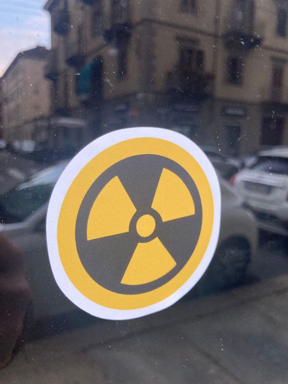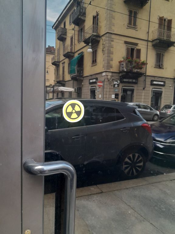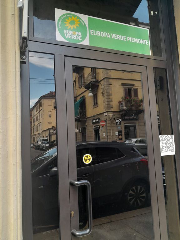 Adesivi pro nucleare attaccati sulla sede di Europa Verde Piemonte in via Monginevro