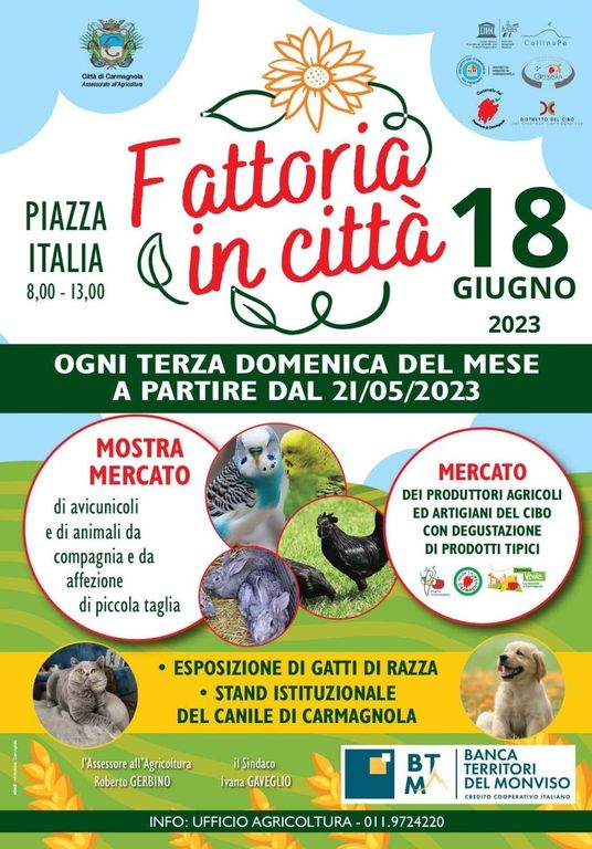 Domenica 18 giugno dalle ore 8:00 alle ore 13:00 in Piazza Italia, è in programma il secondo appuntamento di “Fattoria in Città”, mostra mercato di piccoli animali di Carmagnola.
