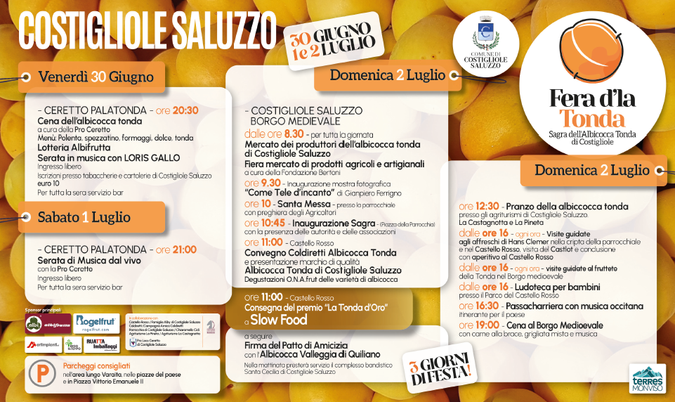 Venerdì 30 giugno, Sabato 1 e domenica 2 luglio a Costigliole Saluzzo torna, per la sua seconda edizione la Fera d’la Tonda - la Sagra dell’Albicocca Tonda di Costigliole Saluzzo.