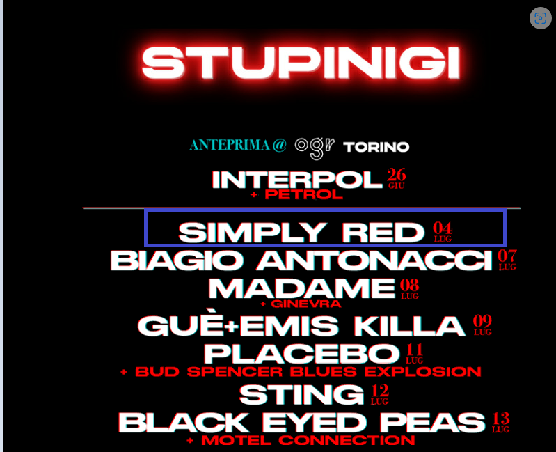 Il programma, che si sviluppa lungo nove giorni per sette concerti esplosivi, si apre con il primo grande nome internazionale del cartellone il 4 luglio con il concerto dei SIMPLY RED del “rosso” Mick Hucknall per festeggiare l’uscita del nuovo album della band, ‘Time’, prevista il prossimo 26 maggio. Anche il 7 luglio Sonic Park Stupinigi regala agli appassionati un grande ritorno al live con il concerto di BIAGIO ANTONACCI, da oltre trent’anni uno dei cantautori più amati, forte di un pubblico trasversale che abbraccia diverse generazioni di estimatori. Dopo l’opening della torinesissima GINEVRA l’8 luglio, per una serata tutta al femminile, arriva sul palco di Sonic Park Stupinigi MADAME: la giovane cantautrice, dopo la seconda partecipazione al Festival di Sanremo, sta riscuotendo un grandissimo successo di pubblico e critica con il nuovo album L'amore. Una serata davvero da non perdere è quella del 9 luglio: sul palco, insieme, GUÈ e EMIS KILLA per un doppio concerto con due fra i più importanti rapper della scena hip hop nazionale. Il secondo imperdibile nome internazionale è quello dei PLACEBO che apriranno l’11 luglio al Sonic Park Stupinigi la tournée di cinque date che vedrà il loro grande ritorno in Italia con la lussuosa performance dei BUD SPENCER BLUES EXPLOSION a fare da special guest della serata. Davvero unico, e carico di emozioni, l’arrivo di STING sul palco il 12 luglio per uno dei tre concerti che l’ex Police terrà nel nostro paese: “My Songs” sarà uno spettacolo dinamico e divertente che si concentra sulle canzoni più amate scritte dall’artista durante la sua prolifica carriera come solista e frontman di una delle band più amate della storia della musica. Un’altra grande band internazionale per la chiusura di Sonic Park Stupinigi il 13 luglio: i BLACK EYED PEAS hanno scelto il festival piemontese per aprire la tournée che li riporta in Italia dopo la trascinante esibizione all’ultimo Festival di Sanremo. L’iconico gruppo musicale vincitore di 6 Grammy Awards e con 35 milioni di album venduti sarà protagonista di una grande festa musicale al ritmo della loro cultura pop con influenze ibride di hip-hop, pop ed elettronica. Il 13 luglio si esibiranno anche i MOTEL CONNECTION.