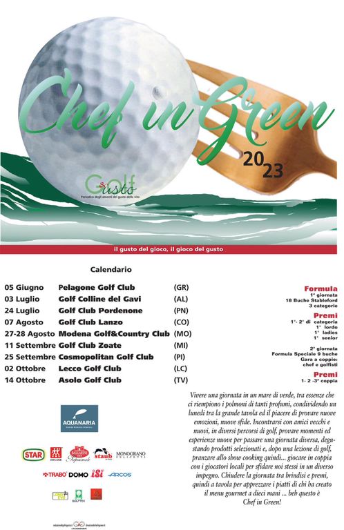 ChefinGreen, marchio registrato da Roberta Candus, direttore ed editore di Golf&Gusto, è un torneo di golf annuale che si svolge dal 2016. In questi anni sono stati oltre 500 gli chef che hanno aderito alla manifestazione e si sono sfidati sul green, 250 quelli che, appoggiate le mazze, hanno poi indossato il grembiule entrando in cucina per firmare piatti che hanno conquistato il palato degli oltre 2000 commensali che dal 2016 ad oggi hanno partecipato alle cene gourmet a conclusione di ogni tappa. Oltre 50 le aziende presenti con aree di esposizione e degustazione dei propri prodotti legati al mondo della gastronomia e non solo.