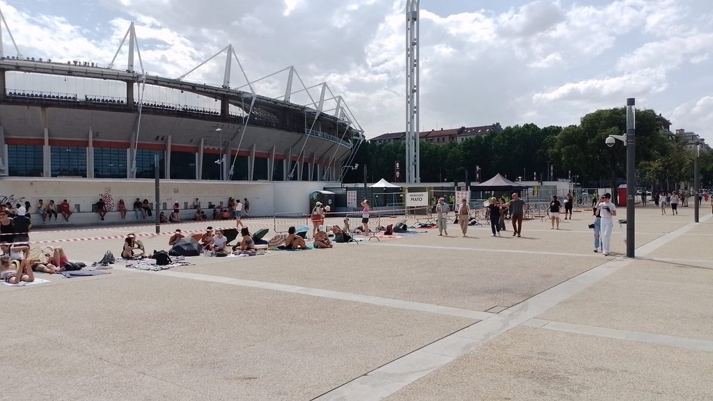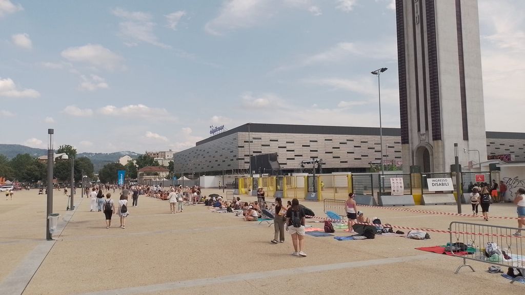 C'è chi si ripara dal sole con una tenda improvvisata, chi sfida il caldo stando sdraiato in costume su teli da mare. Altri si rifugiano sotto gli ombrelli. La fila, su piazza d'armi, prima delle 16 arriva già al campo da basket. Cose che forse nemmeno con Vasco Rossi.