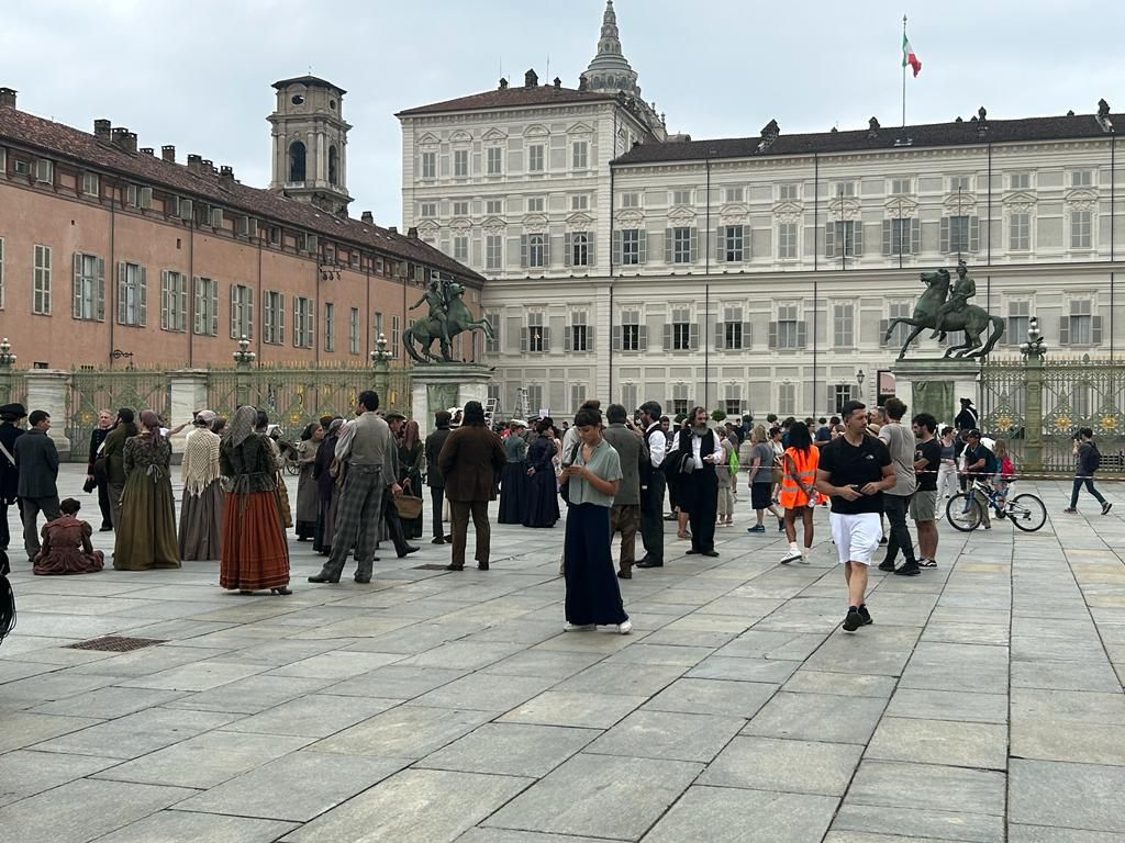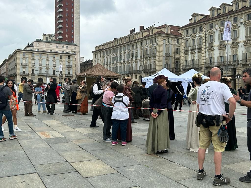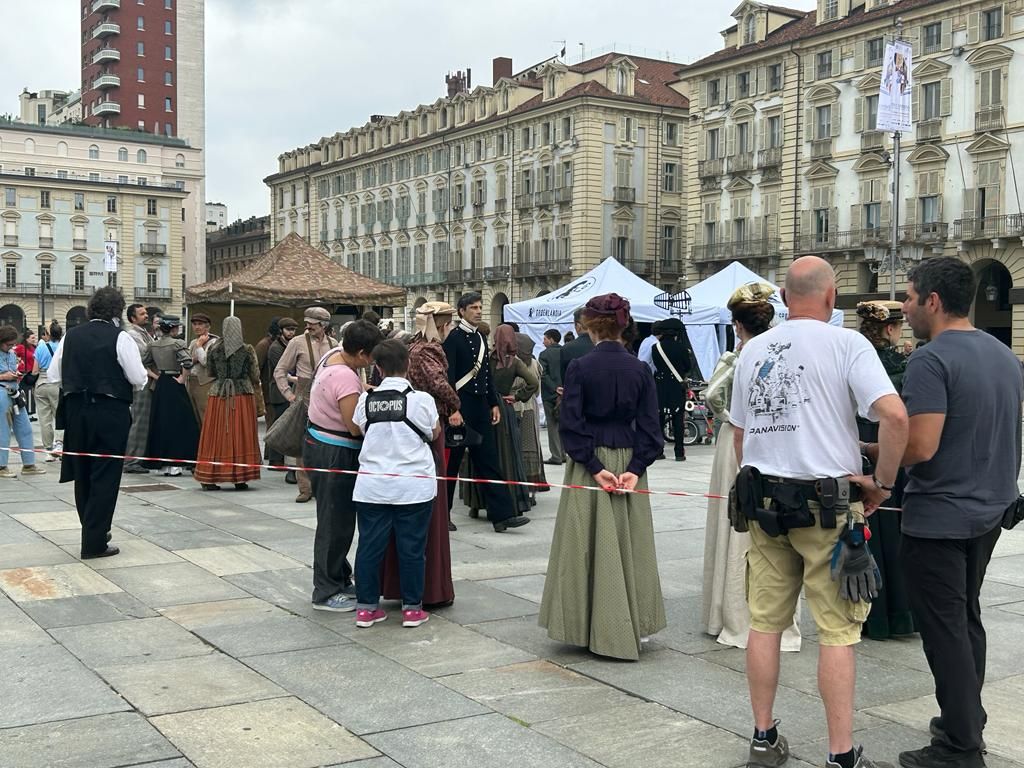 Carrozze, abiti ottocenteschi, carabinieri a cavallo invadono l’area per tutta la giornata di oggi, dopo essere già stati tra le altre in piazza San Carlo, piazza Carlina, via San Massimo.