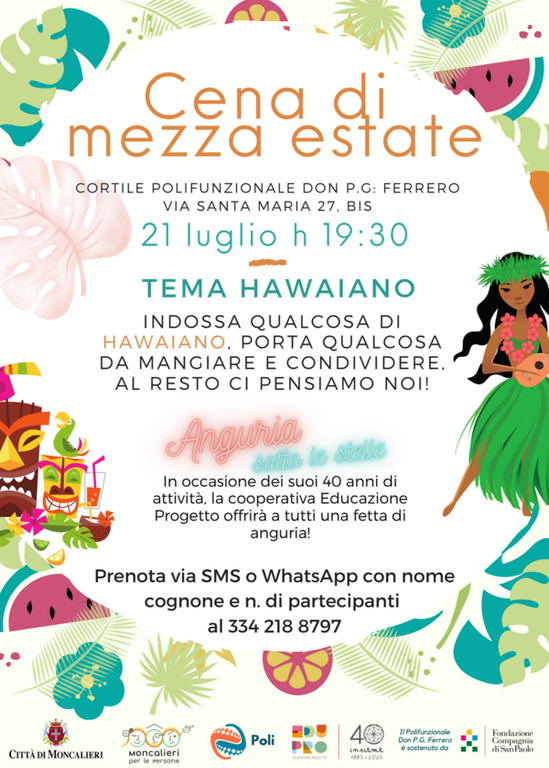 Il cortile del centro polifunzionale Don PG Ferrero, in Via Santa Maria 27 Bis a Moncalieri, diventa un angolo di paradiso hawaiano venerdì 21 luglio a partire dalle 19.30.