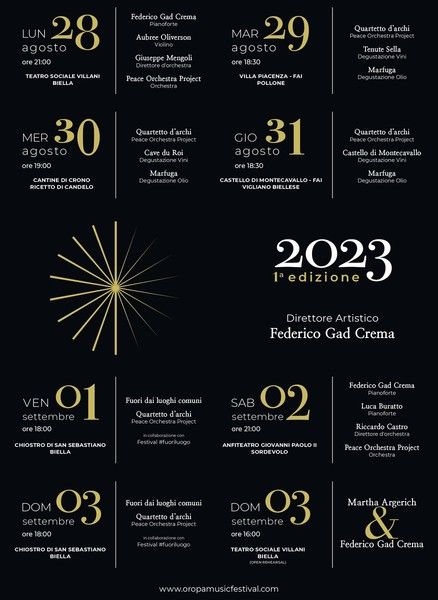 - “Il grande concerto di apertura”, Biella, Teatro Sociale Villani - (28 agosto 2023, ore 21:00) – Federico Gad Crema, Pianoforte; Aubree Oliverson, Violino; Giuseppe Mengoli, Direttore d’orchestra.