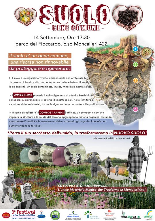 In occasione del terzo Festival della Sostenibilità organizzato dall’Associazione Manzoni People, le Associazioni Parco del Nobile, Impollinatori Metropolitani, Molecola (Legambiente Torino), la comunità del Fioccardo, con il patrocinio della Circoscrizione 8 e la partecipazione di Amiat, si uniranno giovedì 14 settembre alle ore 17:30 al parco del Fioccardo per un workshop dimostrativo: creare insieme nuovo suolo urbano producendo compost rapido in soli 18 giorni, come piccola compensazione all’aumento del consumo di suolo registrato negli ultimi anni.